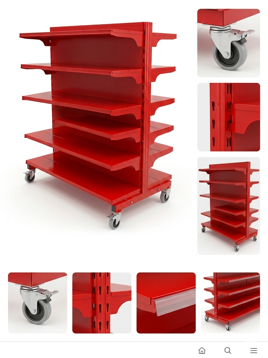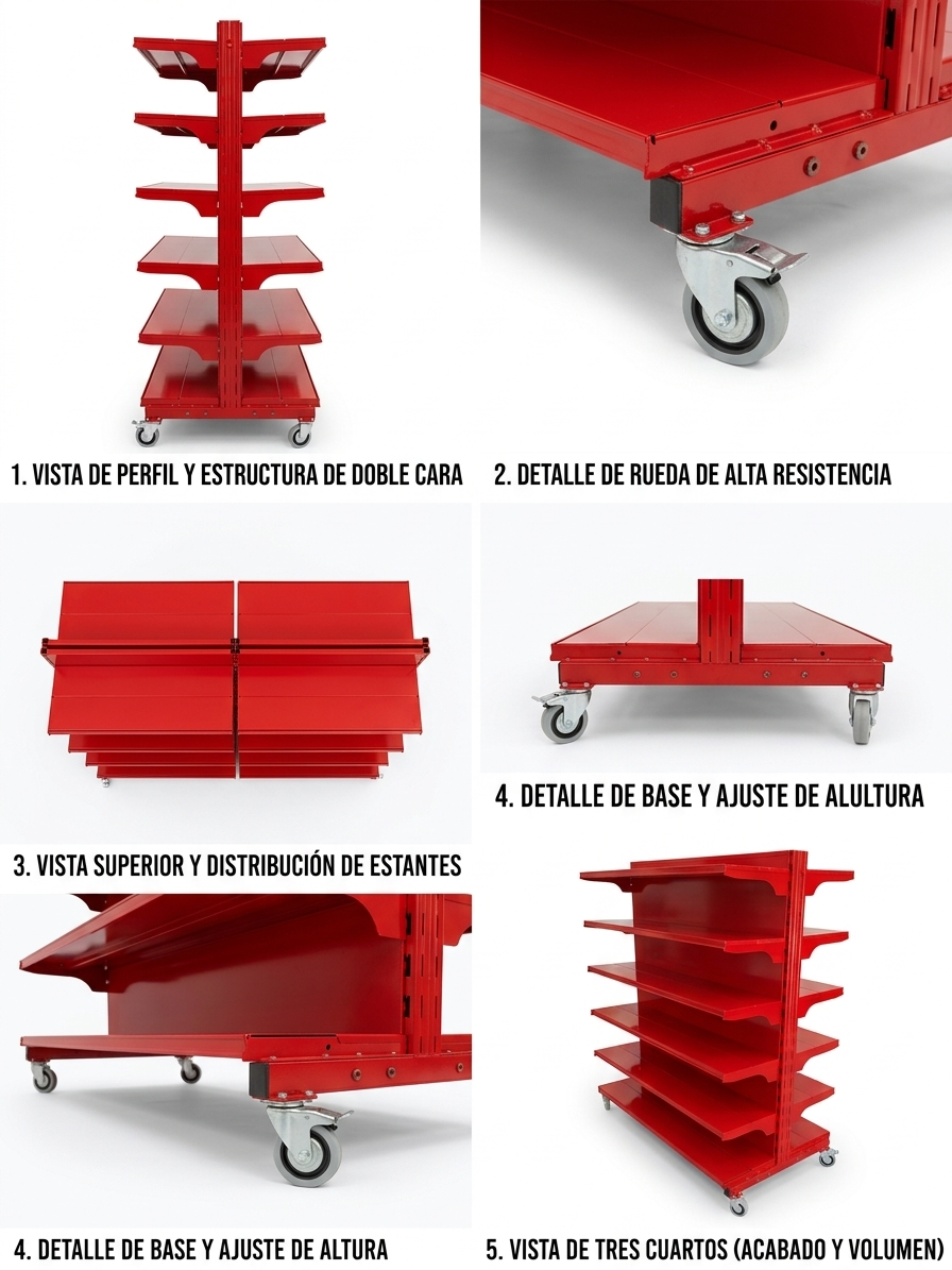 Estructura de Acero Blindado: Acabado en Rojo Intenso con pintura epoxi de alta resistencia. Soporta el roce de carritos y el uso intensivo sin perder el color.