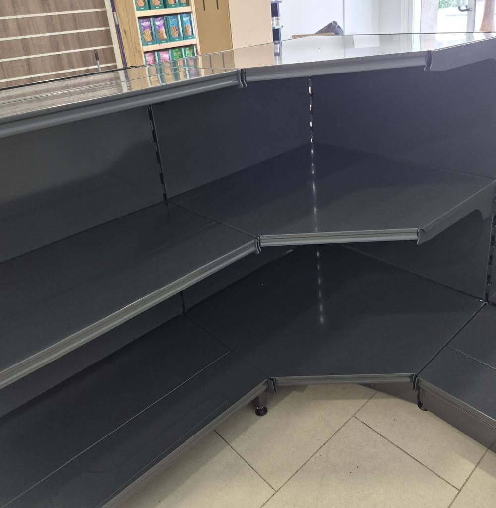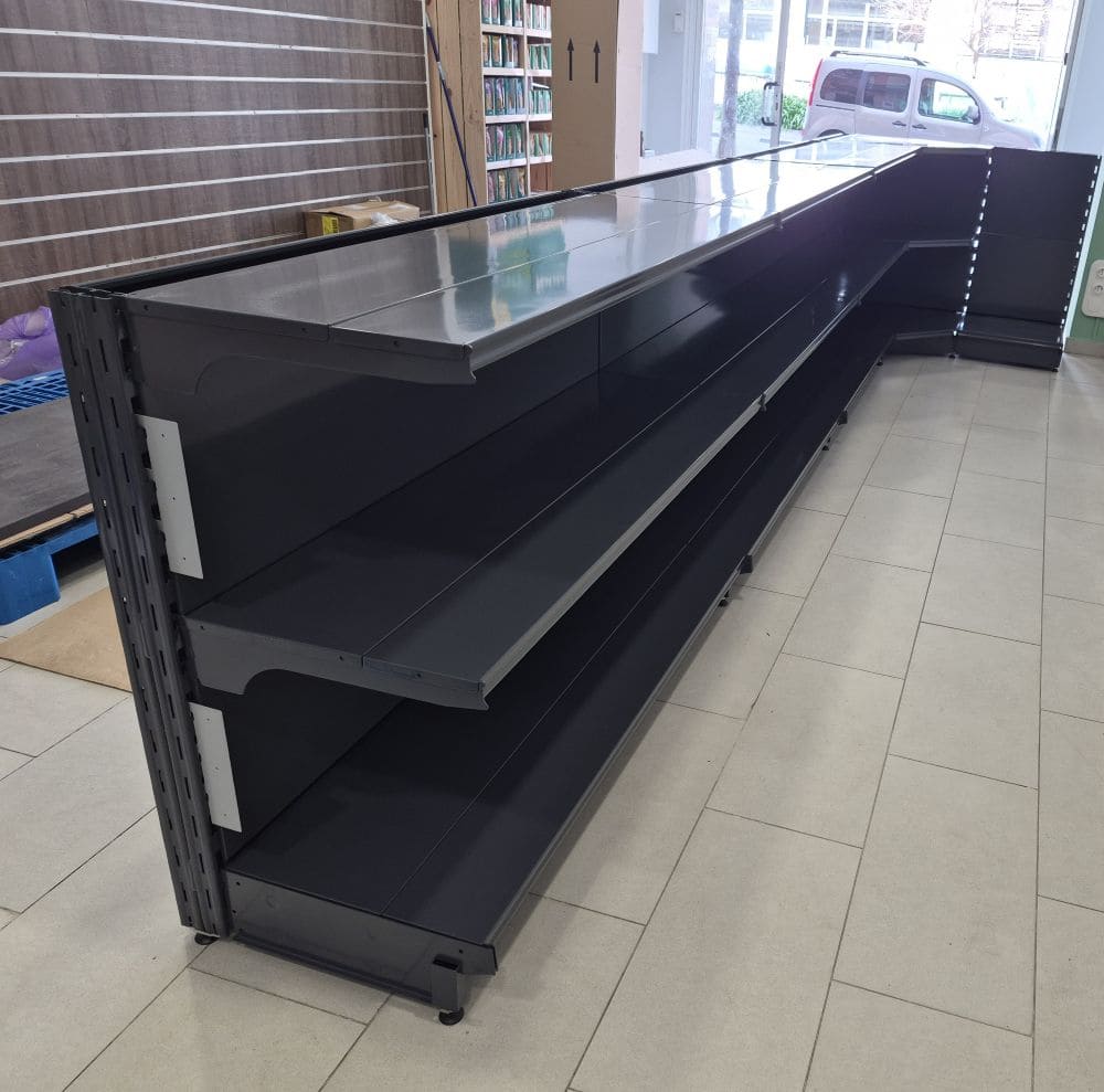 Optimice su punto de venta con el mostrador metálico industrial de alto rendimiento de equipotutienda.com. Este modelo en “L”, con unas dimensiones de 4800 mm de largo y un retorno de 1100 mm, es la solución robusta y elegante para negocios que requieren una zona de atención amplia y duradera.