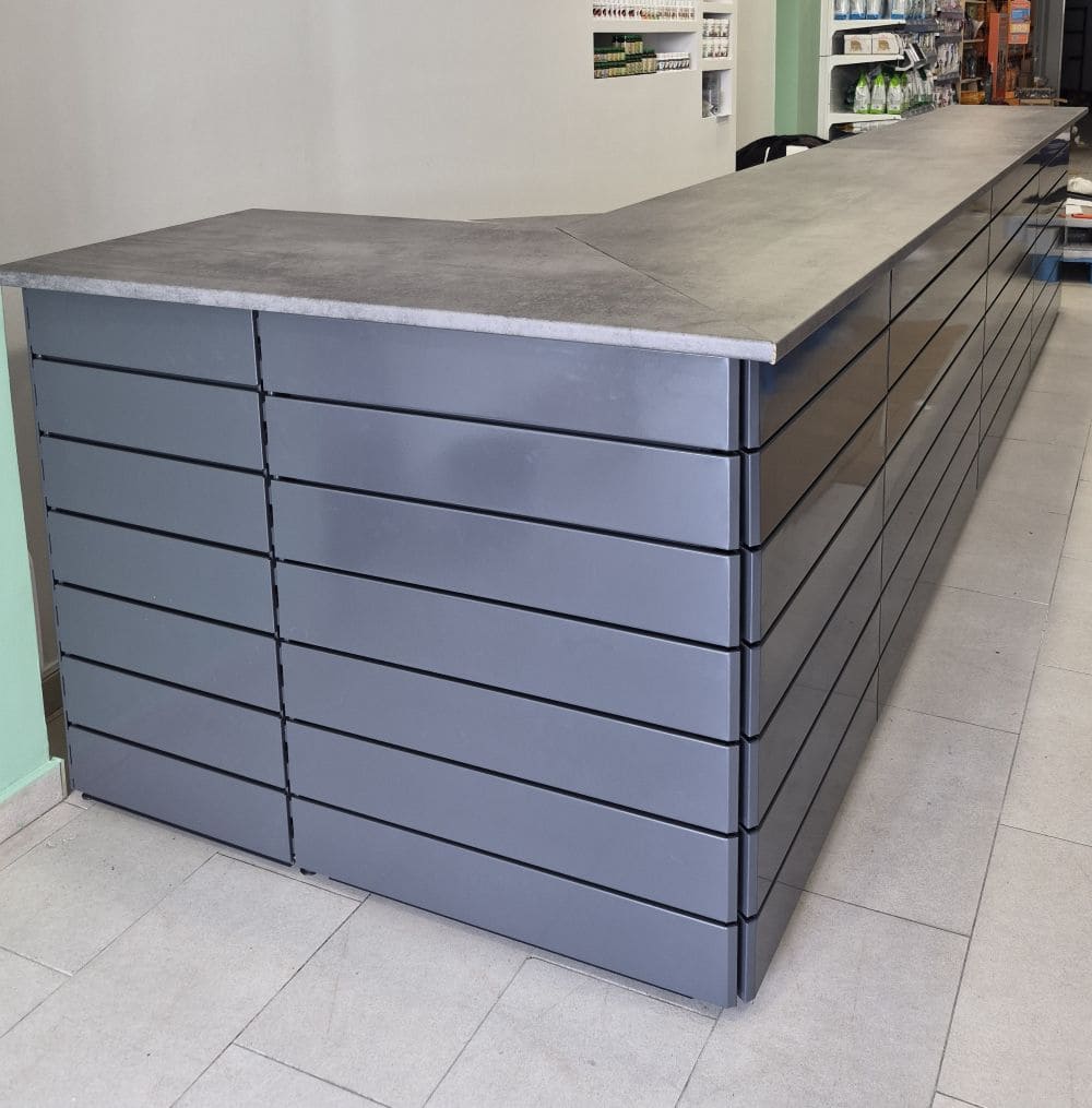 Fabricado íntegramente en España, este mostrador combina la resistencia del acero con un diseño funcional de lamas metálicas, proyectando una imagen de profesionalidad y solidez.